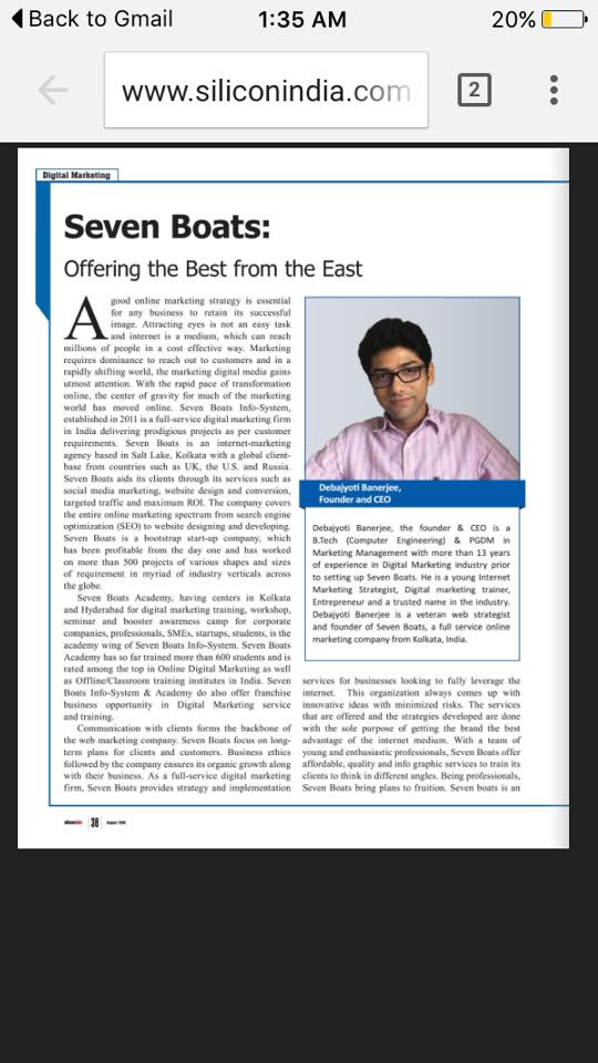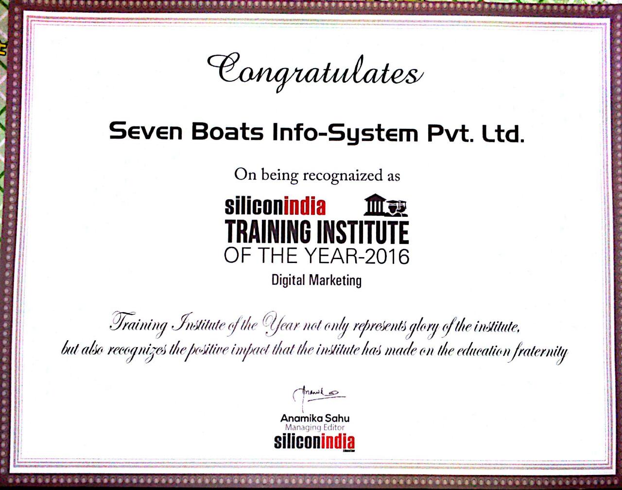 Seven Boats Info-System Pvt. Ltd, Recognized by Government Of India / Ministry of Commerce and Industry under #StartupIndia Seven Boats is digital marketing training partner of Karnavati University, Globsyn Finishing School, Calcutta Business School & IIM Shillong. Seven boats is ranked among Top 50 Digital Marketing Training providers in India by SiliconIndia & Digital Monster Magazine. Among Top 3 Digital Marketing Institutes & agencies in Kolkata by learnpact, coursedekho, quora, coursedom & more.