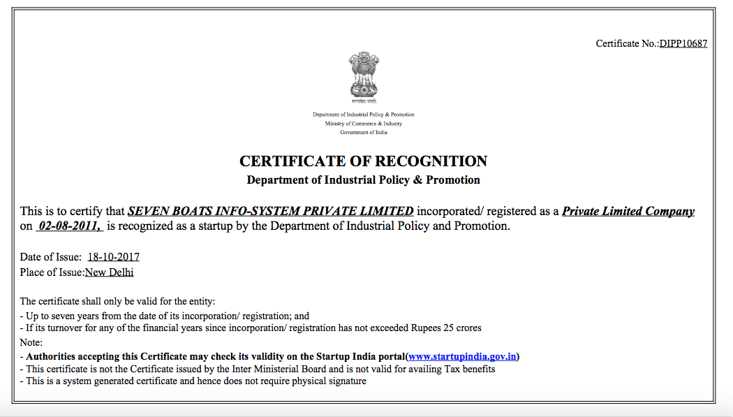 - Recognized by Government Of India / Ministry of Commerce and Industry under StartupIndia