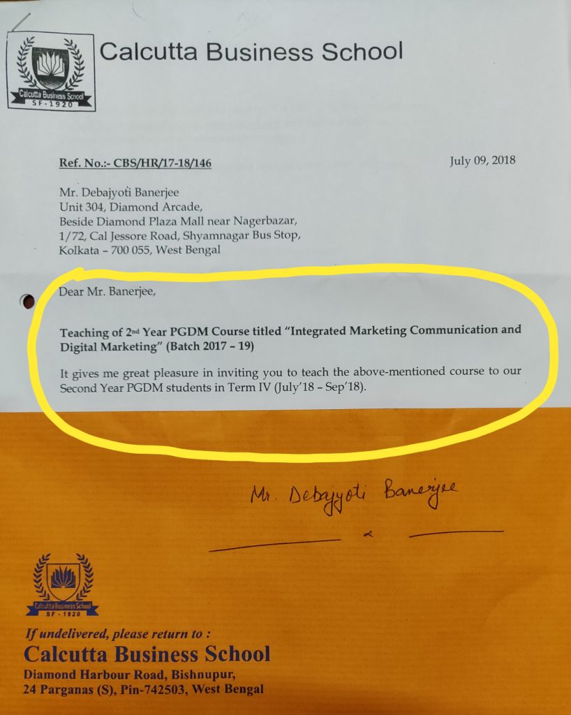 Debajyoti is a Visiting Professor of Digital Marketing for PGDM students at Calcutta Business School & United World School of Business, Visiting Faculty at NSHM Knowledge Campus, Honorary speaker at IIM Shillong & St. Xavier’s College, Visiting trainer at Globsyn Business School, Honorary Member of Departmental Advisory Committee of B P Poddar Institute of Management & Technology, Kolkata, Honorary member of Bengal Chamber of Commerce & Industry’s Friends of IT committee, Executive Committee member of PRSI Kolkata, EC Member of PRCI Kolkata, Online Instructor at Udemy.