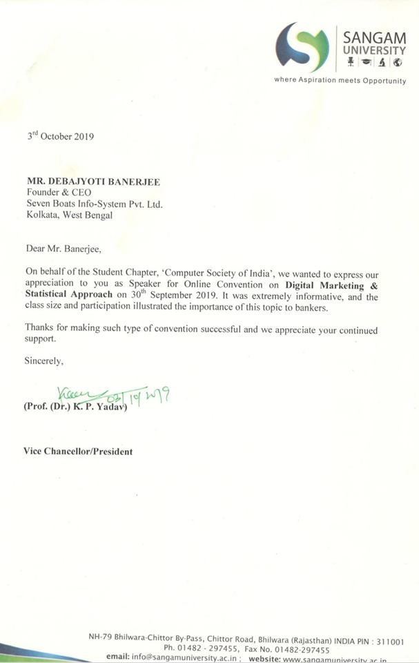 - Invited & Felicitated by Sangam University, Rajasthan at Online Convention on Digital Marketing.