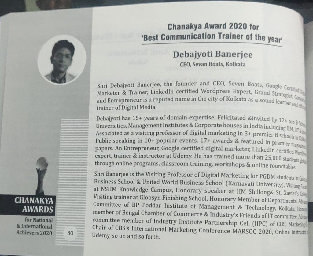 Seven Boats Academy is led by Debajyoti Banerjee, B.Tech in CSE & PGDM in Marketing, Debajyoti has 17+ years of domain expertise. Felicitated & invited by 20+ top B Schools, Universities, Management Institutes & Corporate houses in India including IIM, IIT & more. Associated as visiting professor of digital marketing in 5+ premier B schools in Kolkata & India. Public speaking in 20+ popular Events. 25+ awards & featured in premier magazines & papers. An Entrepreneur, Google certified digital marketer, LinkedIn certified WordPress expert, trainer & instructor at Udemy.