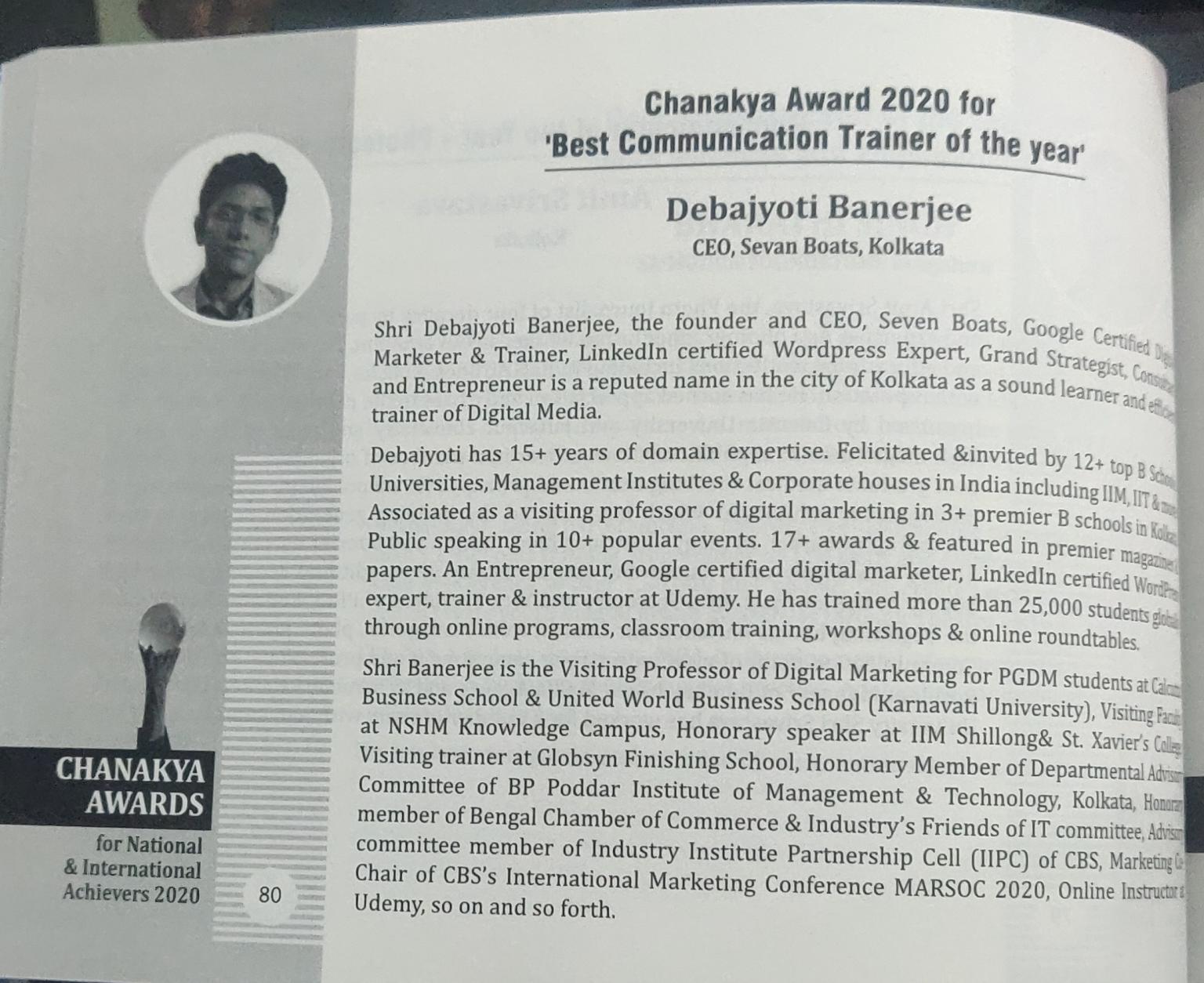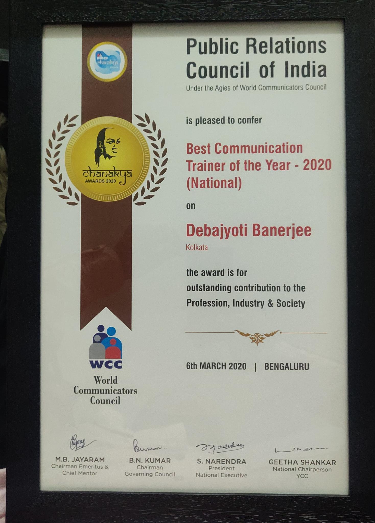 - Debajyoti Banerjee has received prestigious Chanakya Award for Best Communication Trainer of the year (National) by PRCI