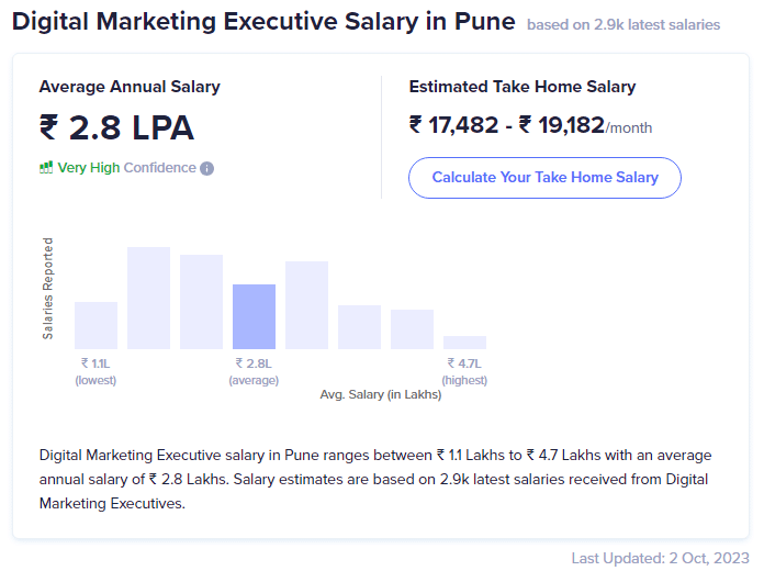 According to data from AmbitionBox, the average annual salary for a digital marketing executive in Pune is ₹2.8 lakhs. However, it’s crucial to acknowledge that these salaries exhibit variations based on experience, skillsets, and the employing organization.