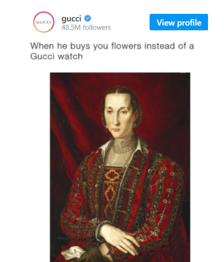 Gucci, for instance, used a Renaissance painting to make this viral meme that also embodied the luxury and good taste that Gucci represents.