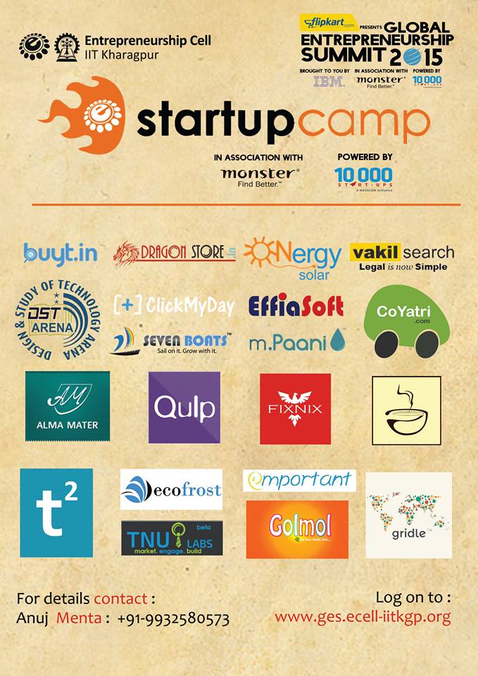 Entrepreneurship Cell, IIT Kharagpur invites you all to Startup Camp , going to be held as a part of Global Entrepreneurship Summit 2015 ! With over 30 start-ups recruiting interns with diverse profiles, the first session is scheduled at 6:30 p.m on 17th January at V1. #GES2k15