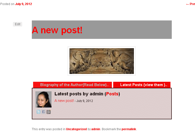 WordPress Easy Author Box Plugin Displays the Authors bio below your  single post. The Box contains author’s avatar, name, post count, site link, personal description and email / social profile links. This plugin will allow you to place author bio in the author url above all the posts posted by the author. This plugin is compatible upto WordPress 3.4.1.